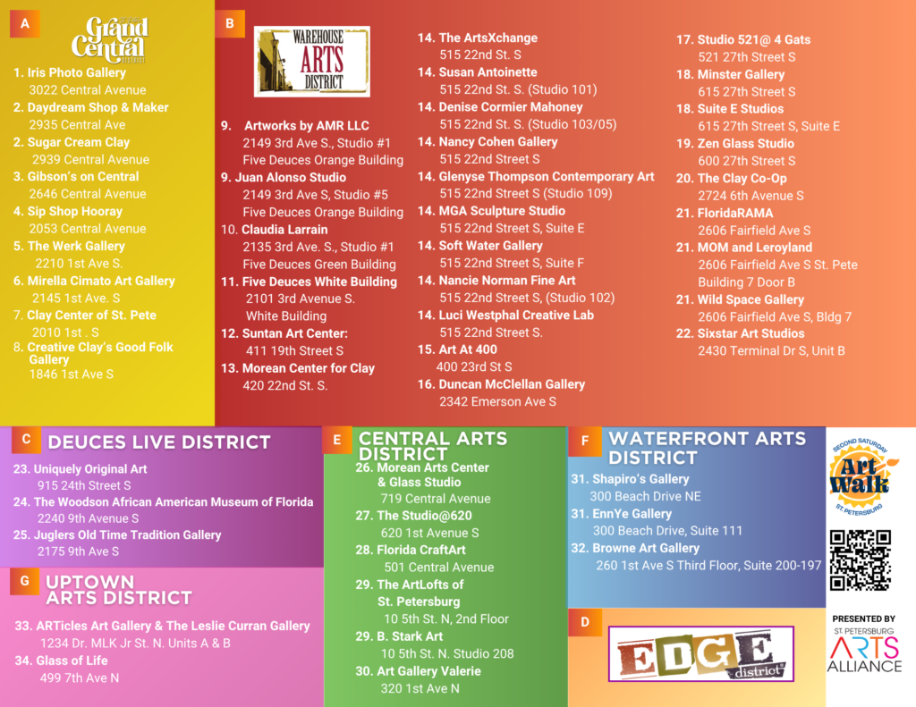 The St. Petersburg Arts Alliance coordinates the St. Petersburg Second Saturday ArtWalk with the EDGE District, the Grand Central District, and the Warehouse Arts District associations.